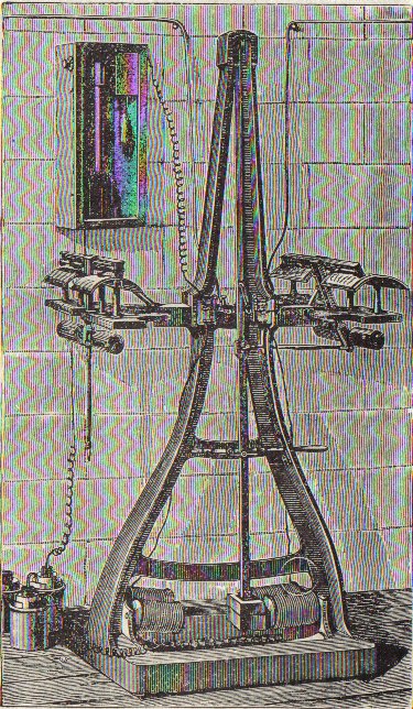 It consisted of a pendulum six feet in length, with an iron bob weighting sixteen pounds, suspended from a iron frame. The pendulum was caused to oscilate between electromagnets, shown opposite the bob, by the alternate opening and closing of local battery, controlled by a “circuit breaker”, represented at the upper left corner of the figure.