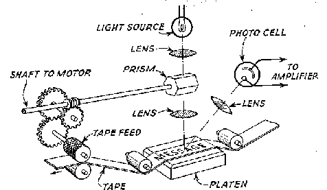 Meanwhile the tape moved forward at a rate to give 60 scanning lines per linear inch. The reflected light from the paper was collected by a phototube, and thus facsimile impulses were obtained and amplified in the usual way.