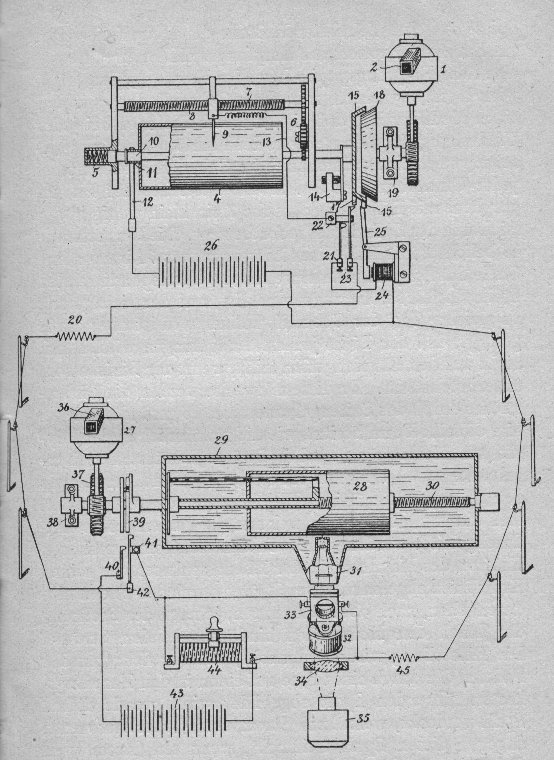This current is transmitted through the line and at the distant end controls the intensity of a strong light that is concentrated on a small portion of a sensitized film wrapped around a cylinder similair to that at the transmitting end. This cylinder revolves in a box impervious to light.