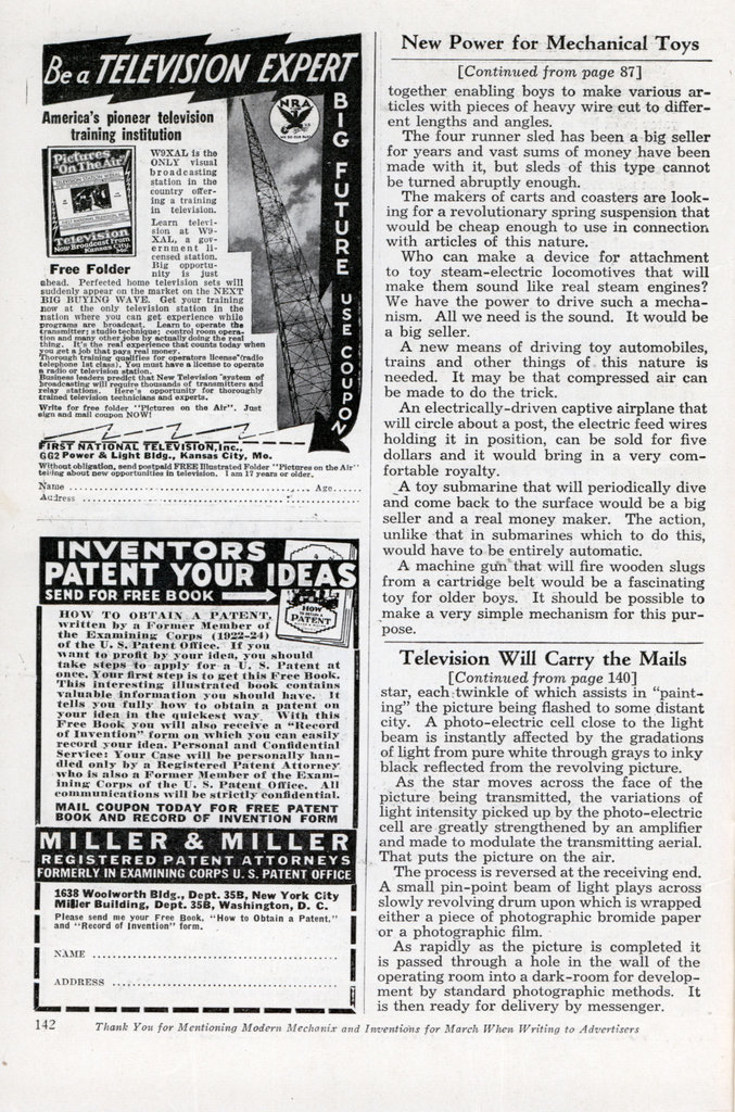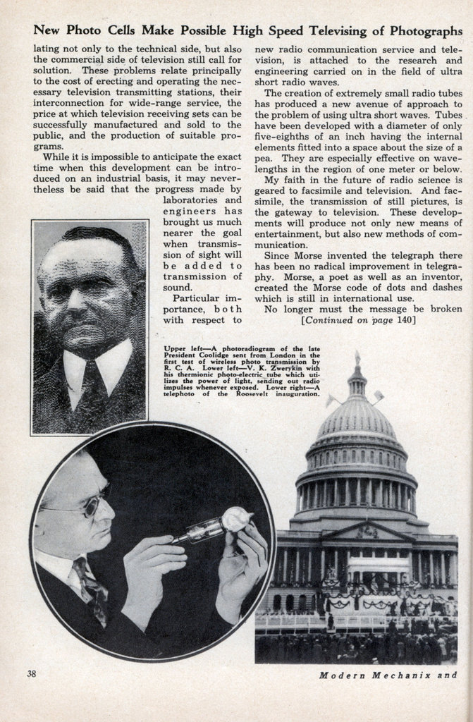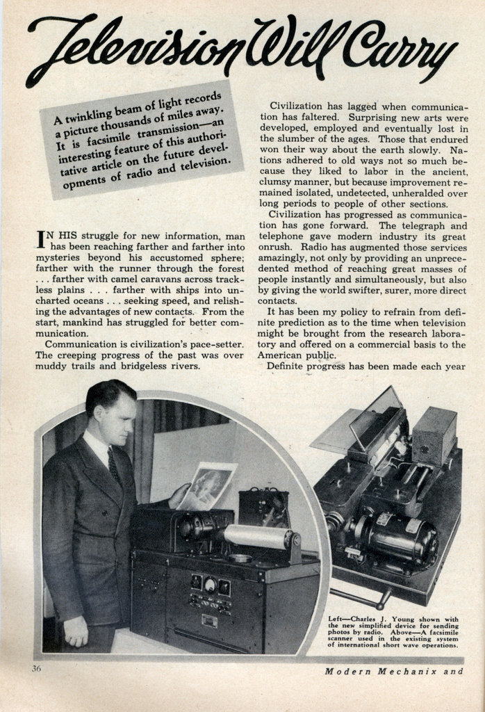 The first logical step, of course, is to transmit still pictures and print. That is facsimile radio. The next step will be to send moving pictures. That is television. When the latter is accomplished, it will be possible to see a face or an object through space and to reproduce a newspaper page instantaneously.