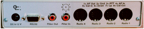 4 radio ports, each equipped with audio in/out, ptt, up, down, cat in and cat out pins.