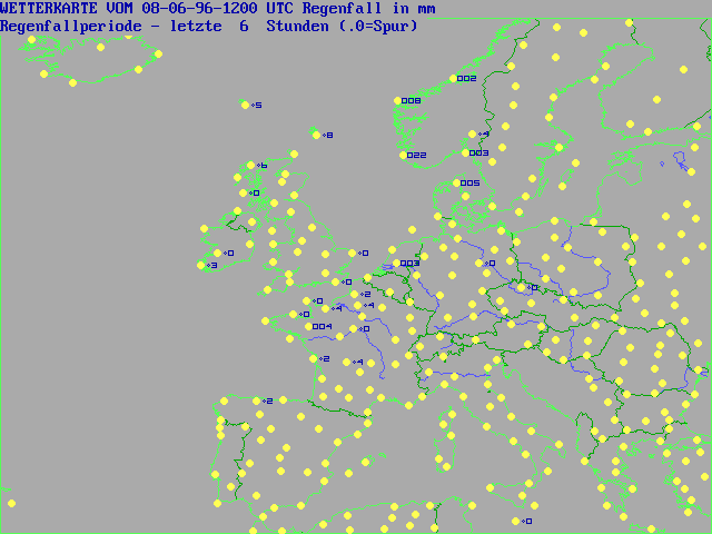 Receive the RTTY Synop Data via Shortwave and plot your own Weather Maps with SKYVIEW SYNOP from Skyview Systems UK ( Germany Supra PC SYNOP from SupraTec). Here are some example maps from Europe, Sunday 08-06-96 1200 UTC (a "tropical" day here in Germany) represents reports FM 13 (Ships) and FM 11 (Land Stations) plotted witht the German version Supra PC SYNOP 5.2: